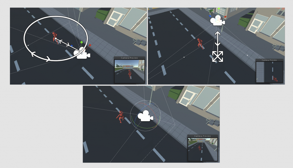 I implemented different virtual cameras in a scene in Unity that allow the observer to interactively view the environment and the VR user that moves within the environment.